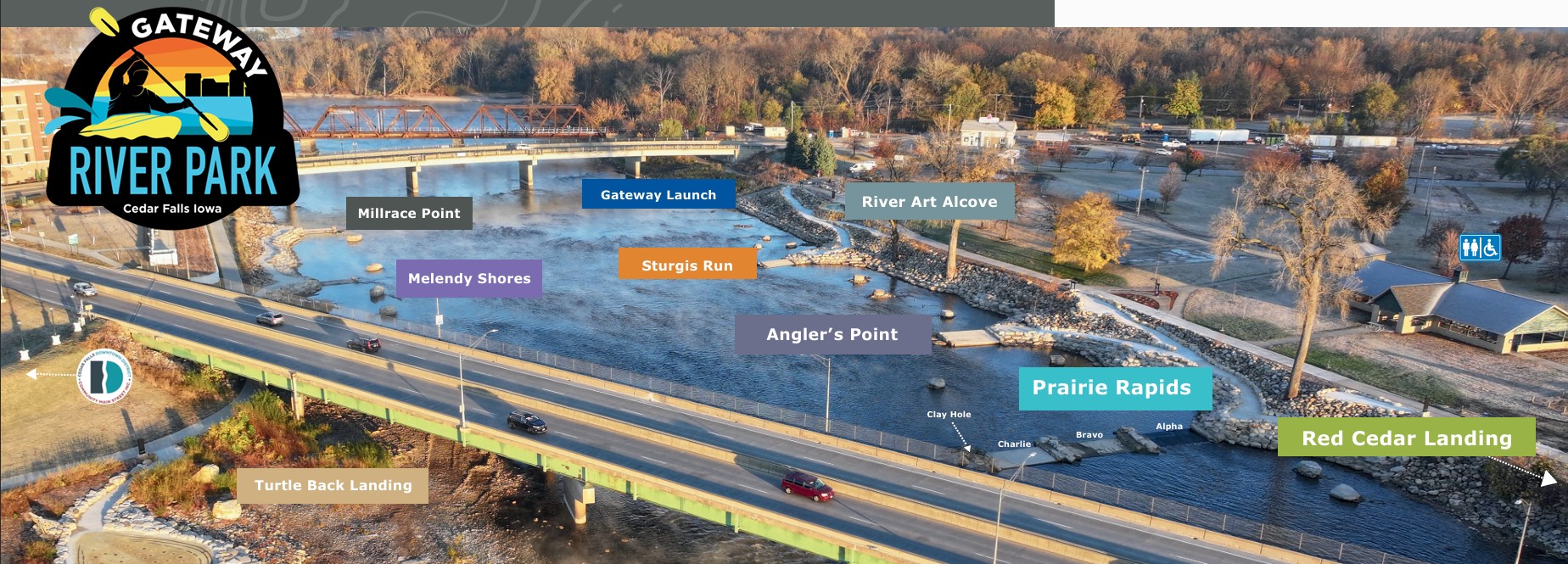 The Cedar Falls Whitewater park is located on the Cedar River in Cedar Falls, Iowa. It is a “park & play” spot in the Cedar Falls Gateway River Park Complex. The whitewater park mitigated a former beautification dam associated with the Clay Equipment Company. Read more about the history of the Cedar Falls dams on the Cedar Falls Dam page. The whitewater park was completed in 2025. The venue is comprised of 4 distinct whitewater features with excellent eddy access. The prime water levels for all features have yet to be determined and paddlers are encouraged to notify the IWC on what water levels they recommend/use.