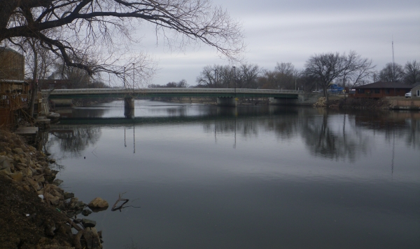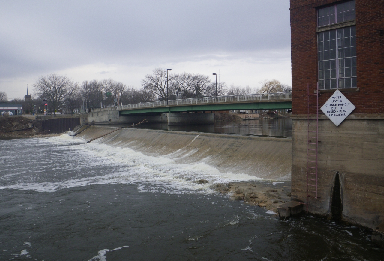 Portage option: none. Take out at Peerin Park two blocks upstream from dam on river left. Carry or transport through town crossing Traer Street bridge. Put in well downstream at Greene Recreational Area on river right.