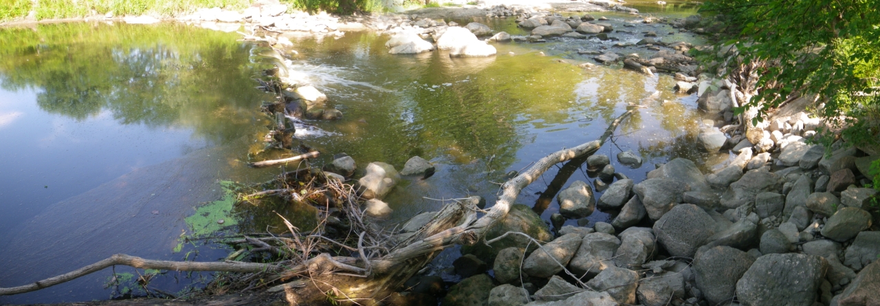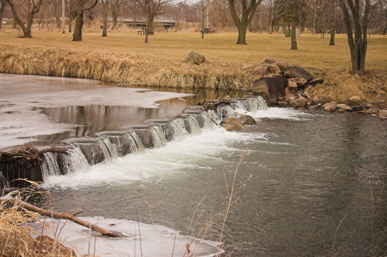 Comments: This dam is the site of the first low head dam modifications in the state. Work to convert the dam into a rock rapids was completed in 2007. The effort greatly reduced the deadly hydraulic that often formed at the previous low head dam. After modification and at higher water levels the rapids become a feature suitable for enjoyment by whitewater kayakers. Unfortunately the area has deteriorated due to underestimated forces that displaced undersized arched rock rapids structures